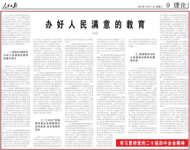 12月17日,教育部党组书记、部长怀进鹏在《人民日报》“学习贯彻党的二十届四中全会精神”专栏发表署名文章《办好人民满意的教育》,其中提到,“建设高素质专业化教师队伍。教师是立教之本、兴教之源,建设教育强国,必须培养造就让党和人民满意的高水平教师队伍。要大力弘扬教育家精神,健全师德师风建设长效机制,弘扬尊师重教社会风尚。建设高质量教师教育体系,推动高水平大学开展教师教育,强化教师全员培训,提升教师专...