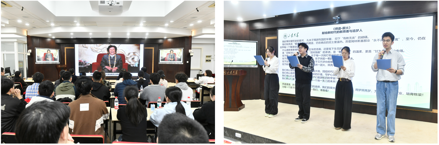 全体师生共同温习回顾了“人民教育家”于漪先生对山东大学师生的寄语,感悟其“一辈子做教师,一辈子学做教师”的崇高精神。“国优计划”学子随后带来诗朗诵《师道·薪火》,以真挚情感表达对教育事业的坚定追求。